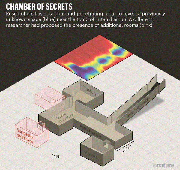 Группа исследователей под руководством бывшего главы министерства по делам древностей Египта Мамдоха Элдамати использовала георадар (GPR) для сканирования территории вокруг гробницы Тутанхамона. Согласно сделанному заявлению, им удалось идентифицировать прежде неизвестное коридорное пространство в нескольких метрах от погребальной комнаты. Об их открытии ранее в феврале было доложено министерству по делам древностей.