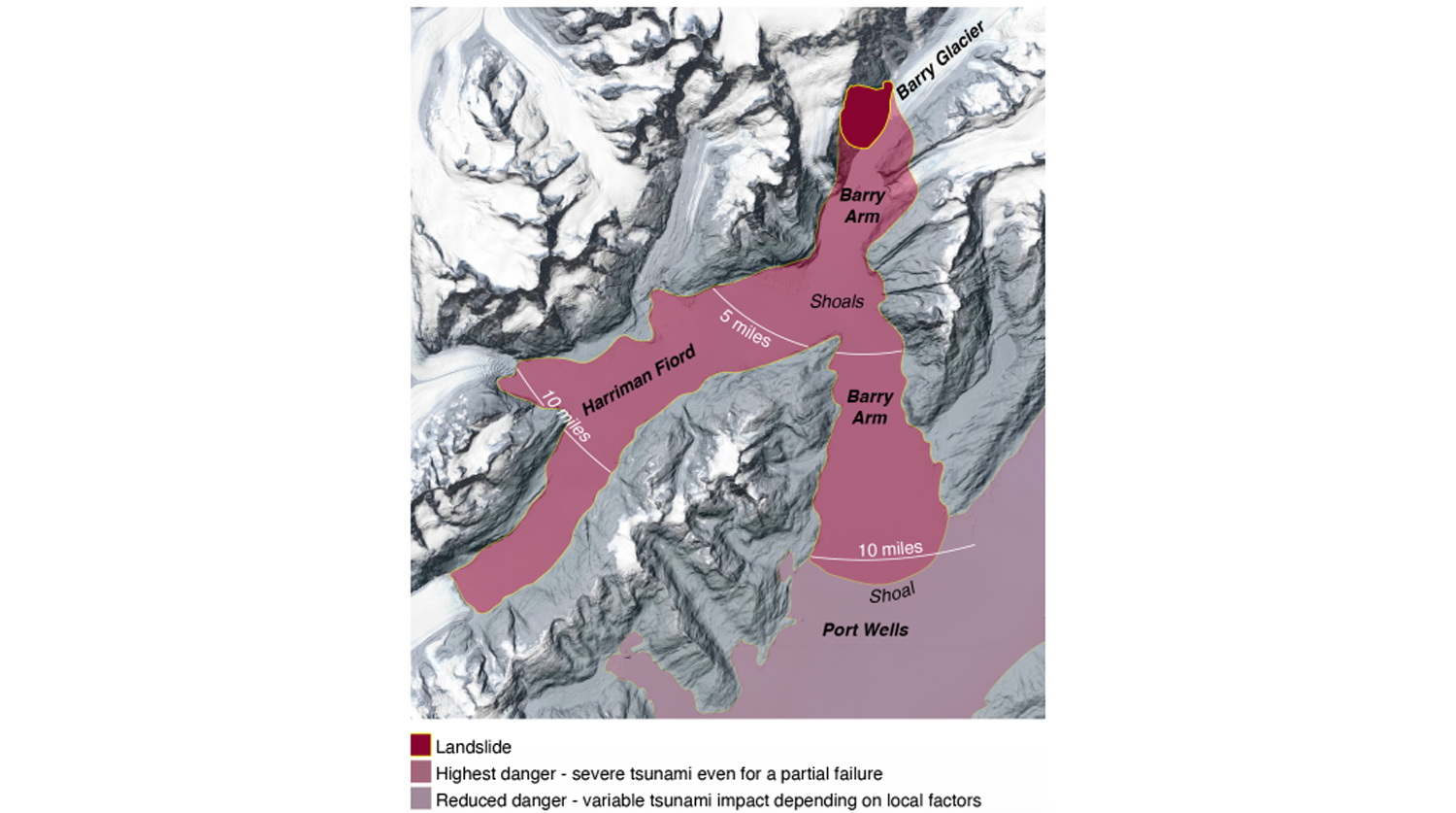 Произойти это может в районе залива Принс-Уильям, расположенного к востоку от полуострова Кенай. Об опасности катастрофы накануне предупредили местные ученые в открытом письме. По словам Стива Мастермана, директора местного подразделения Геологической и геофизческой службы, его коллеги получили свидетельства, что быстрое таяние ледника Барри примерно в пятидесяти километрах от городка Уиттиер в 121 километре от Анкориджа чревато катастрофой.