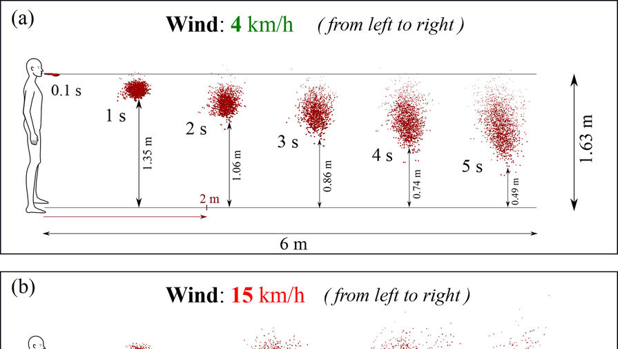 При температуре воздуха около 20 градусов и влажности 50% и при нулевой скорости ветра частицы слюны действительно не перемещались более чем на два метра. Однако даже при легком ветерке скоростью 4 км/ч микрокапли слюны оказались способны преодолеть 5,5 м за пять секунд.