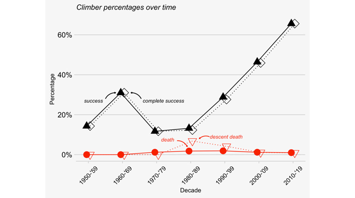 Однако одним из наиболее интересных выводов стало то, что процент восхождений, заканчивающихся гибелью альпинистов, с 1990 года не изменился, и сегодня составляет примерно 1%.