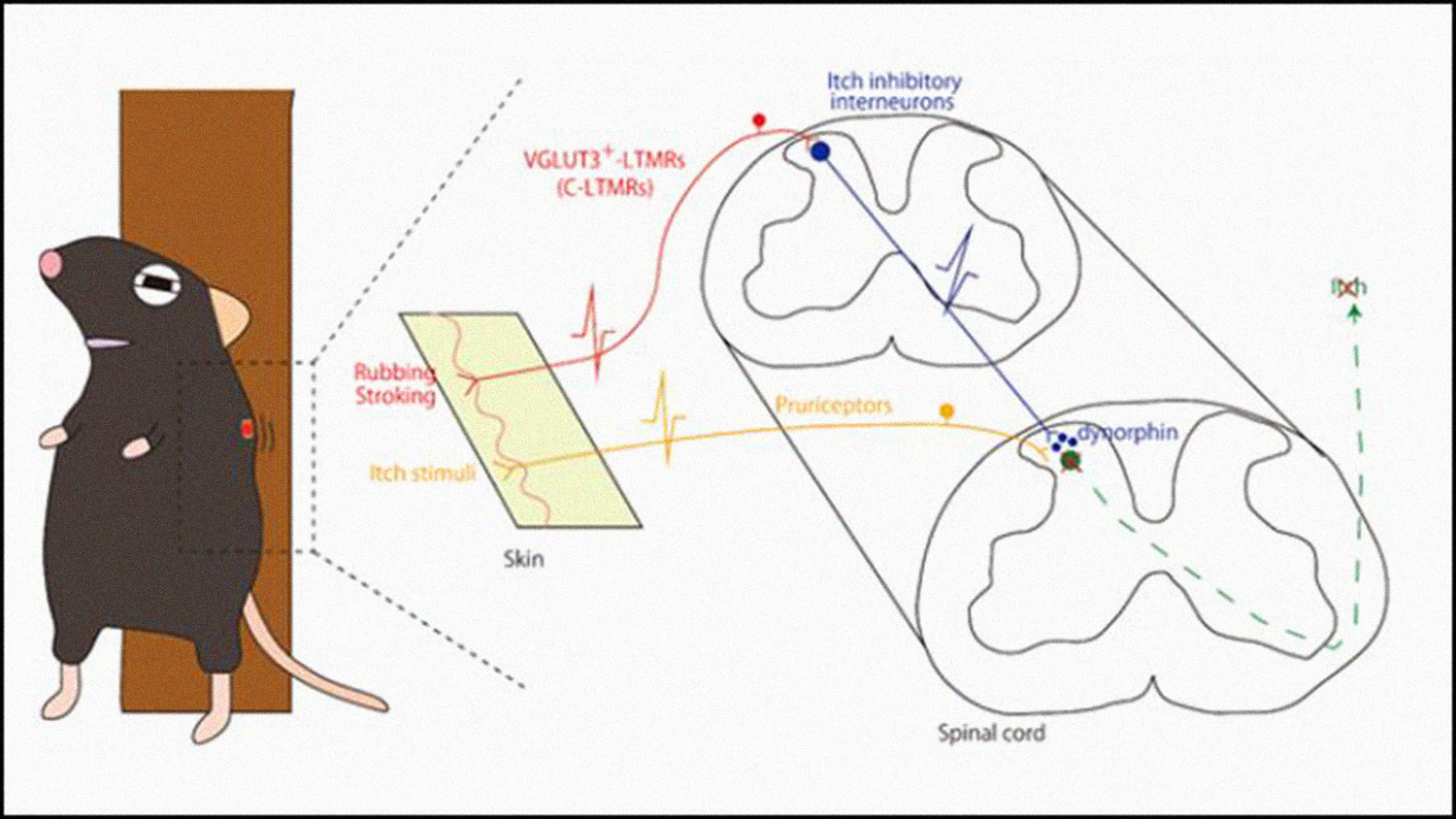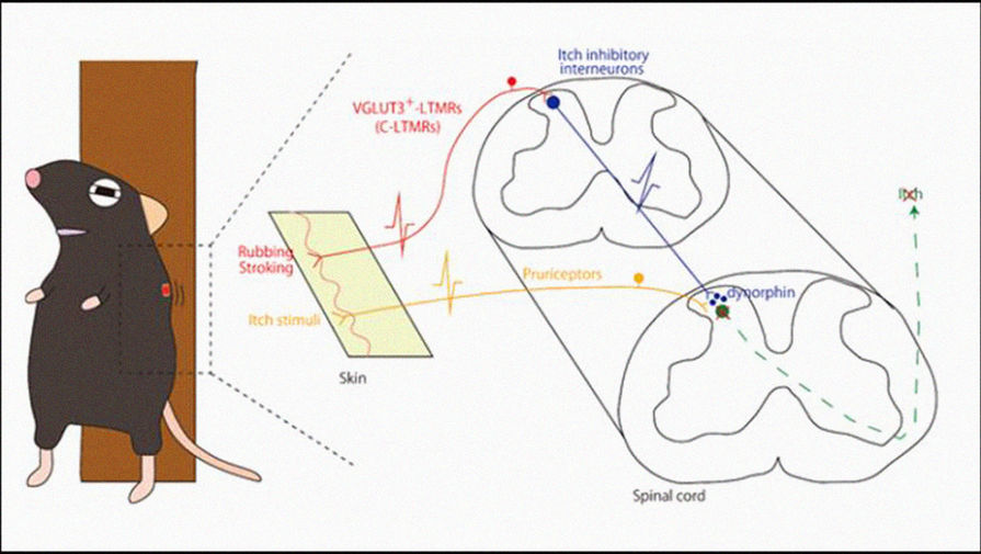«Известно, что при трении или поглаживании кожи зуд проходит, — пишут исследователи. — Трение или поглаживание кожи обычно используется для облегчения зуда в чувствительных областях, таких как глаза или нос, а также часто используется людьми с хроническим зудом. Мы исследовали механизмы вызванного прикосновениями снижения зуда у мышей. Поглаживание кожи уменьшило активность чесания чувствительных нейронов спинного мозга».