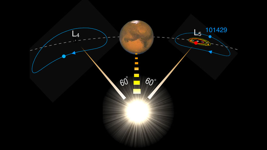 Он относится к так называемым троянским астероидам, которые неотрывно следуют за планетой вокруг Солнца и находятся в так называемых точках Лагранжа L4 и L5 – своеобразных гравитационных ловушках, одна из которых опережает планету на 60 градусов, другая — отстает от нее.