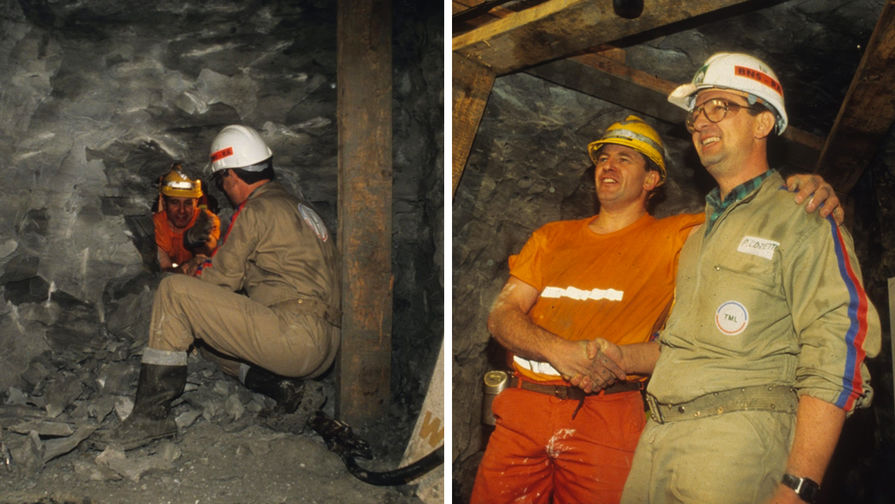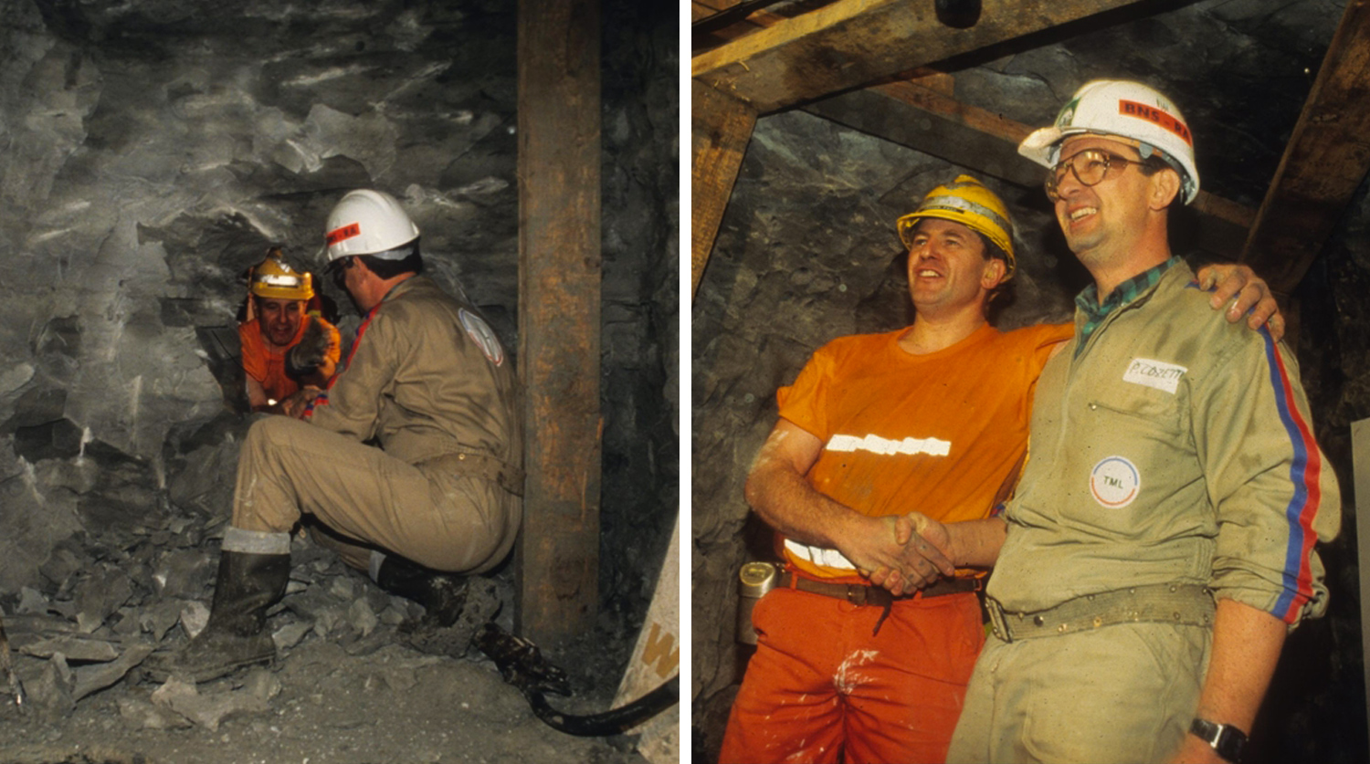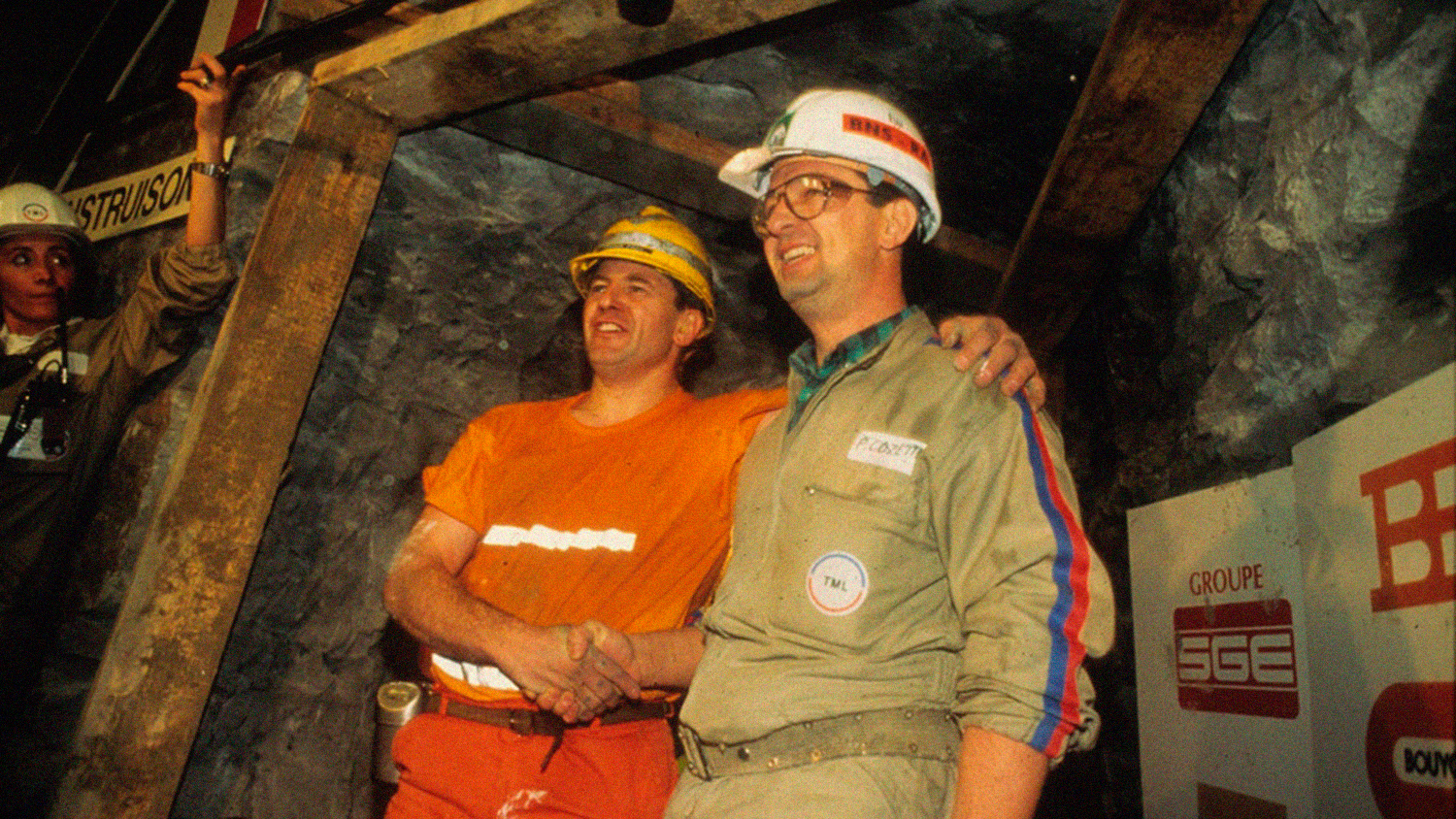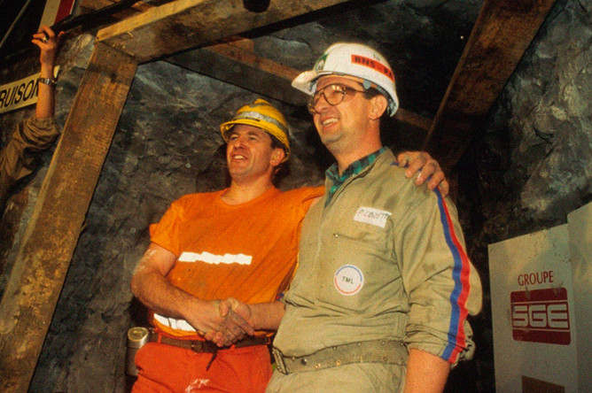 1 декабря 1990 года строители Евротоннеля из Франции и Великобритании встретились в намеченной заранее точке на глубине 40 м под дном Ла-Манша. Последние метры тоннеля британцы и французы рыли вручную с помощью кирок и лопат. В 12 часов 12 минут и 12 секунд 37-летний француз Филипп Козетт отложил кирку и через образовавшуюся в известняке дыру пожал руку 42-летнему англичанину Грэму Фэггу. Это произошло в 22,3 км от Великобритании и в 15,6 км от Франции. После того как инженеры увидели друг друга в небольшом проеме, окружавшие их рабочие принялись расширять «окно», чтобы две группы людей смогли пройти в гости друг к другу.