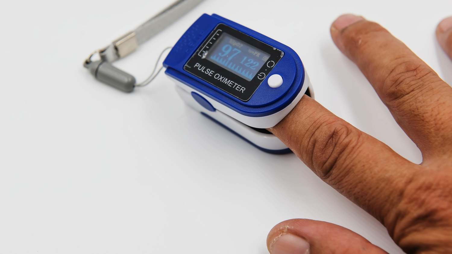 Пульсоксиметр — небольшой прибор, который часто выполнен в форме «прищепки», надеваемой на палец. С помощью световых сигналов он определяет, насколько кровь насыщена кислородом. Оксигенация (насыщение крови кислородом) в норме составляет около 95%, когда она падает ниже 88%, необходима медицинская помощь.