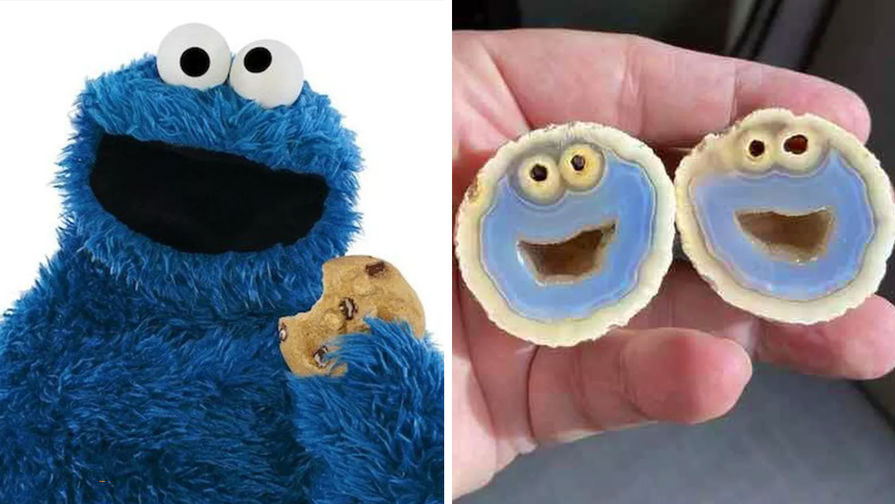 В руки британского геолога Майка Бауэрса попал крупный агат из Бразилии. Внутри Бауэрса ждал сюрприз: невзрачный, похожий на яйцо камень в разрезе выглядел как лицо Коржика, любителя печенья из детского телешоу «Улица Сезам».