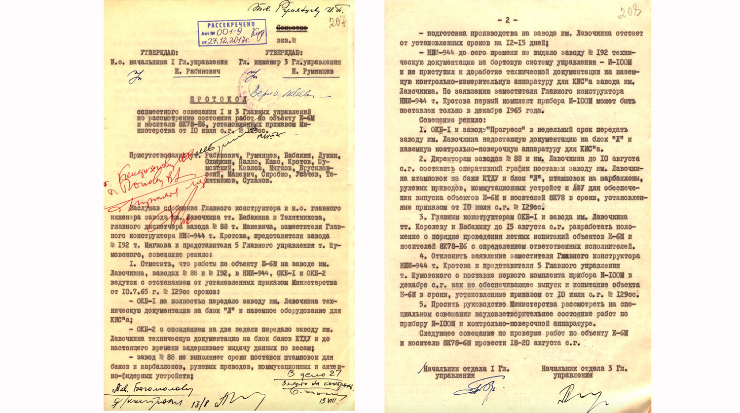 Протокол совместного совещания 1 и 3 Главных управлений Министерства общего машиностроения по рассмотрению состояния работ по объекту Е-6М и ракет-носителей 8К78-Е6