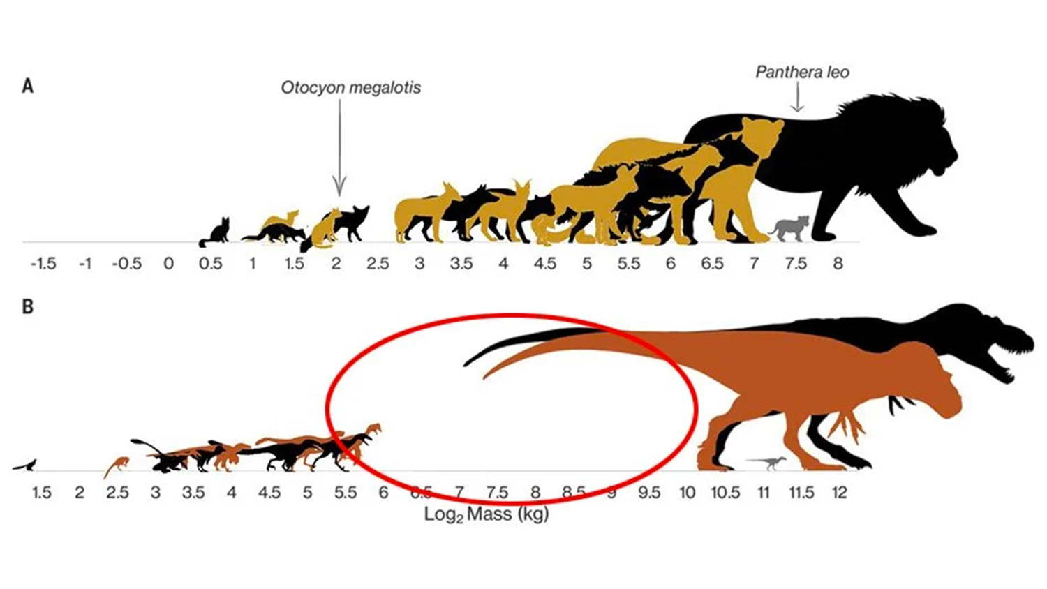 Чтобы разобраться в вопросе низкого видового разнообразия среди динозавров, исследователи собрали данные об известных ископаемых со всего мира, включая более 550 видов динозавров. Сортируя динозавров в зависимости от массы тела и рациона питания, ученые заметили: в экологических нишах, где присутствовали крупные тероподы (хищные ящеротазовые динозавры), было очень мало хищных динозавров массой 100-1000 кг. Однако в эту нишу хорошо вписывались юные потомки динозавров-гигантов.