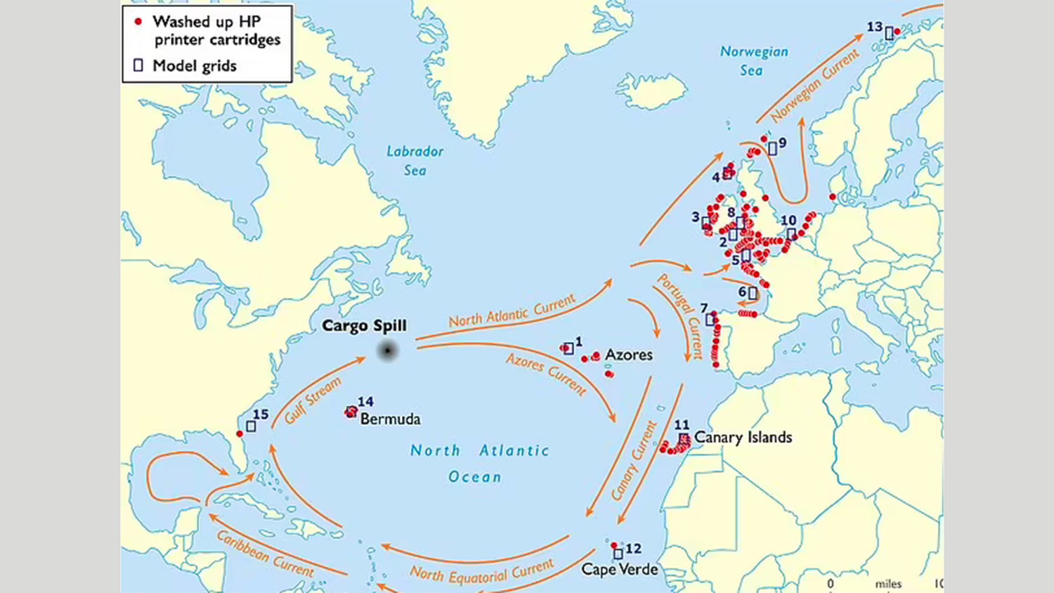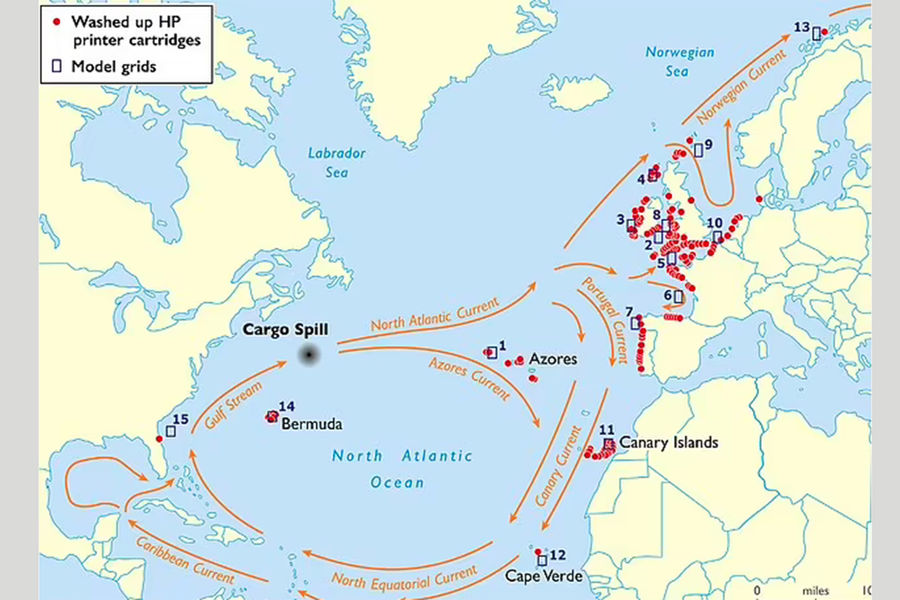 Норвежское течение донесло картриджи до Норвегии. Азорское течение оставило их на Канарских островах. Некоторые картриджи оказались в Гольфстриме и добрались до Бермудских островов и Флориды.