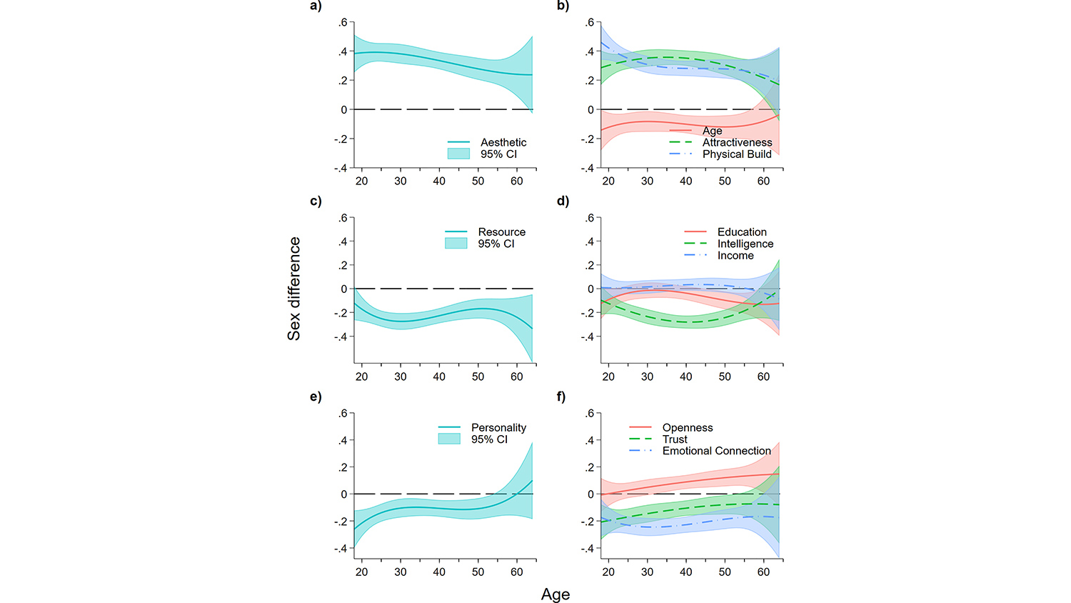 Более интересными оказались изменения предпочтений с возрастом. Хотя мужчины в целом придавали эстетическим характеристикам большее относительное значение, чем женщины, с возрастом этот разрыв сокращался — мужчин начинали сильнее интересовать другие качества, женщины же обращали больше внимания на внешнюю привлекательность. При этом зрелые женщины интересовались личностными качествами партнера меньше молодых. Представители обоих полов с возрастом придавали большее значение открытости и доверию.