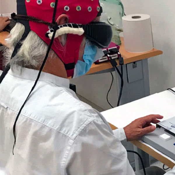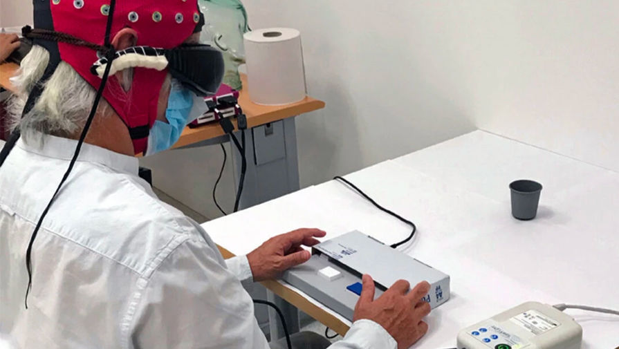Во время некоторых испытаний на мужчину надевали шапочку с электродами, которые могли определять активность мозга через кожу головы. Когда очки посылали сигналы на сетчатку глаза, это активировало области мозга, участвующие в зрении.