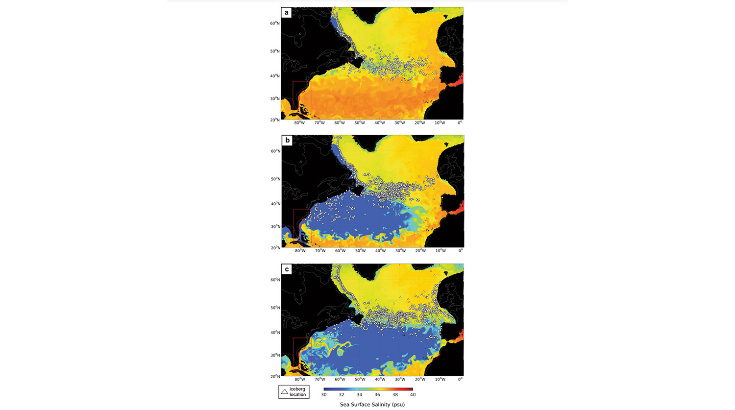 В наши дни средняя температура океана южнее Мыс Ха́ттерас в Северной Каролине составляет 20-25°C. По расчетам ученых, чтобы достичь этих широт, айсберги должны дрейфовать против Гольфстрима, который течет на север. Это обстоятельство указывает на то, что древние айсберги могли проникать глубоко на юг лишь в периоды коротких, но массовых выбросов пресной воды в океан.