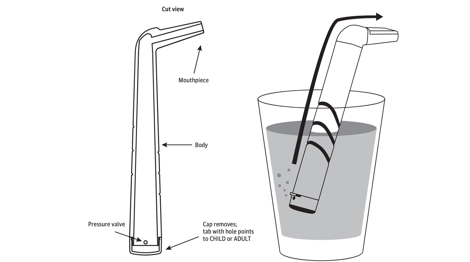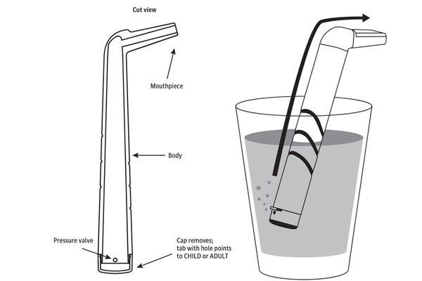 Сейфи и его коллеги разработали устройство для питья HiccAway — жесткую L-образную трубочку с загубником на одном конце и с клапаном давления в виде маленького отверстия на другом.