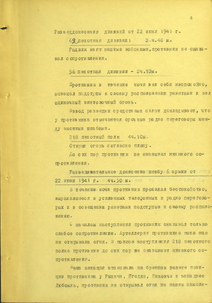 «Противник застигнут врасплох. Все мосты удалось захватить. Вначале отмечалось лишь незначительное сопротивление противника, в воздух подняты отдельные самолеты русских, противник ведет слабый артиллерийский огонь», — говорится в донесении, отправленном в 5 утра 22 июня.