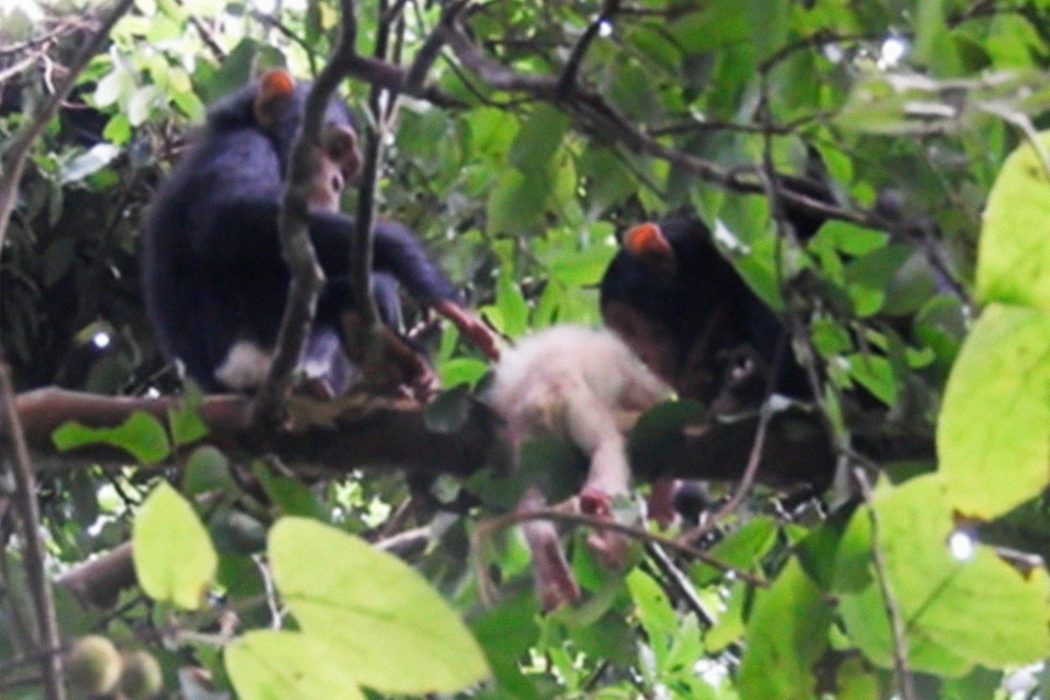 Вскоре на глаза ученым попался взрослый самец шимпанзе с детенышем гориллы на руках. Малыша осмотрели еще трое шимпанзе. Затем самец положил его на землю и трижды ударил. Неподалеку раздались крики взрослой гориллы.