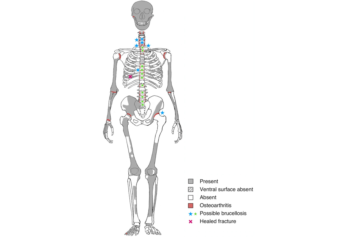 «Тяжелые артритические изменения в левом тазобедренном суставе ранее приписывались травме, но в остальном никаких доказательств травмы нет, — пишут исследователи. — Наличие эрозий и новообразований кости позволяет предположить, что, помимо возрастного первичного остеоартрита, который мог присутствовать изначально (и который также наблюдается в правом тазобедренном суставе и обеих плечевых костях), имело место вторичное явление, т.е. инфицирование тазобедренного сустава бруцеллезом».