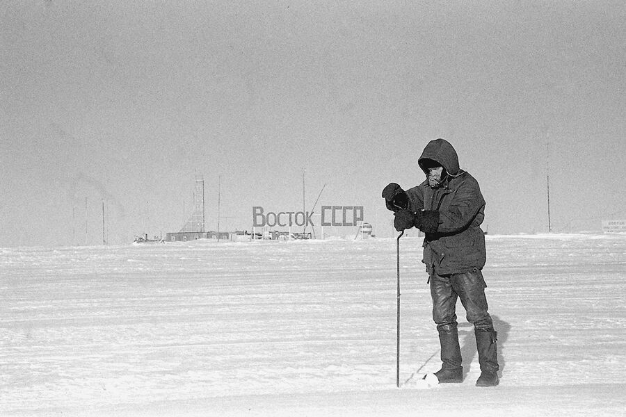 Сотрудник советской антарктической полярной станции «Восток» во время работы. Климатические условия в районе станции одни из тяжелейших на Земле, 1984 год