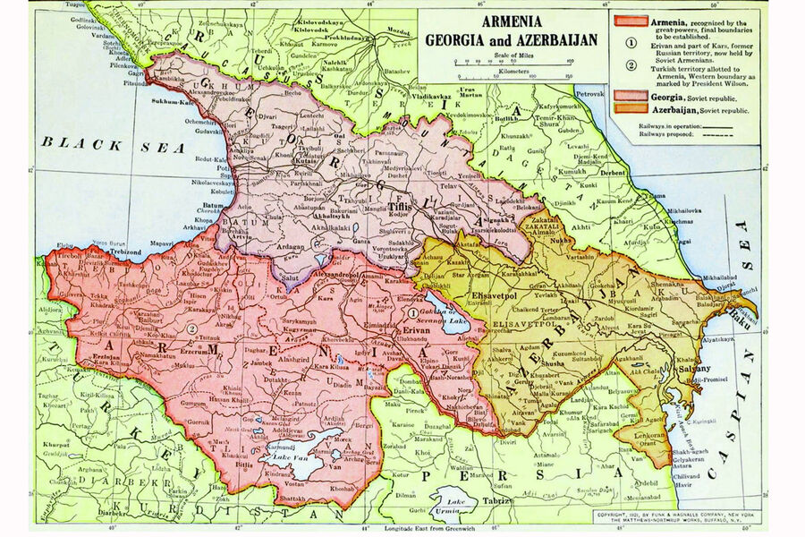 Американская карта 1921 года, показывающая западную границу Армении с Турцией по Севрскому договору, установленную арбитражем президента Вудро Вильсона. Первоначальные границы и спорные территории Советских республик Закавказья, установленные после Московского договора