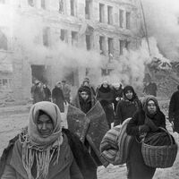 Жители блокадного Ленинграда выходят из бомбоубежища после отбоя тревоги, 1942 год
