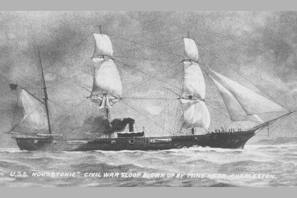 Бой Hunley с Housatonic начался около 20:45, когда наступили сумерки. Экипаж шлюпа все равно заметил атакующих, но было слишком поздно: лодка находилась прямо под кораблем, а развернуть вниз основные орудия было невозможно. Ее принялись обстреливать из легкого стрелкового оружия, но это не помогло. Hunley завела мину под днище, отсоединила ее (по одной из версий, мина осталась закрепленной) и дала задний ход. Через несколько мгновений раздался взрыв, шлюп получил крен на левый борт и начал быстро тонуть. Экипаж потерял пять человек, остальных спасли подошедшие корабли Союза.
