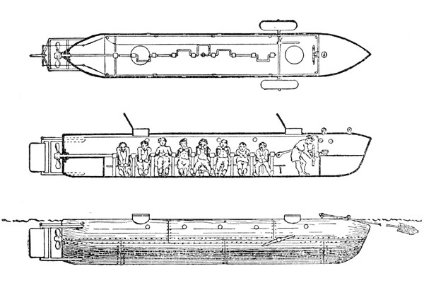 Оставалось два вопроса: как крутить этот винт и как лодка будет атаковать противника? Для первой задачи сначала думали использовать паровой или ранний электрический двигатель, но в итоге решили прибегнуть к самому простому варианту. Вдоль лодки, боком по ходу движения сидели семь матросов-гребцов и руками вращали коленвал (коленчатый вал, т.е. деталь сложной формы, имеющая шейки для крепления шатунов, от которых воспринимает усилия и преобразует их в крутящий момент), ведущий к двигателю. Восьмым членом экипажа был рулевой. Сидеть гребцам приходилось вплотную без возможности встать или сменить позу.