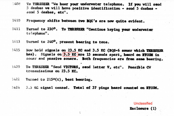 «Если вы отправите 5 тире, мы будем считать, что контакт подтвержден, — отправьте 5 тире», — передавали с Seawolf по подводному телефону. Однако реконструкция событий показала, что на тот момент на борту Thresher выживших не было, а голоса и стуки доносились, скорее всего, с соседних эсминцев.