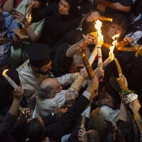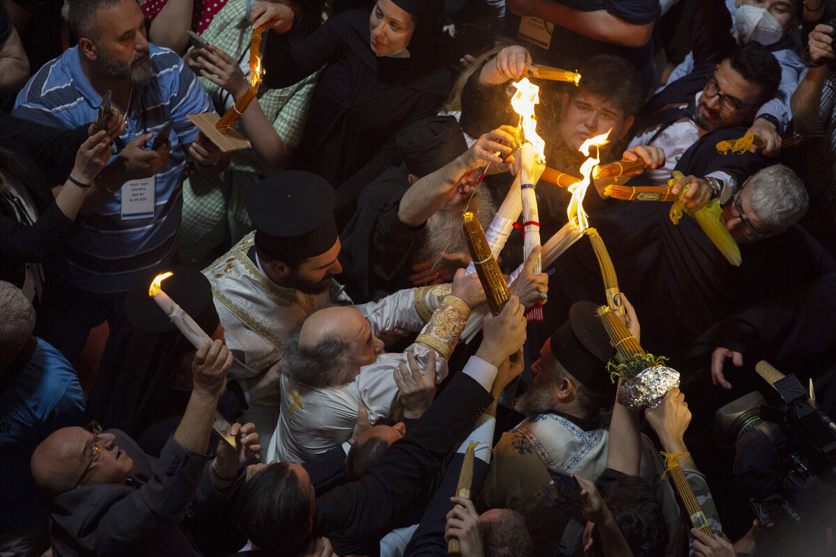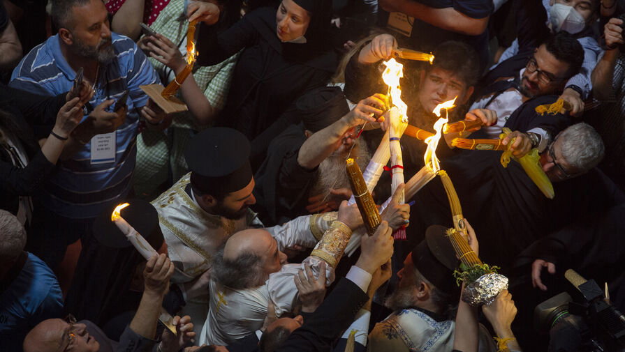 Паломники в храме Гроба Господня, где Иисус был распят, похоронен и воскрес из мертвых, держат свечи, толпясь на церемонии схождения, стараясь своими глазами увидеть чудо. Церемония каждый год транслируется по телевидению во многих странах мира.