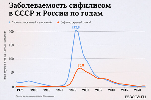 — Я считаю, что помогает. Люди читают жалобы, это помогает их отрезвить. Кроме того, широко продаются презервативы, которые раньше были редкостью. Поэтому сифилис сейчас в общем снижается, и, в том числе, в России, но отмечается рост числа поздних форм заболевания. Подъем был в 1995-1997 году в России. Сейчас число заражений идет вниз, и все же в советском 1989 году сифилиса было меньше, чем в 2023-м. В некоторых регионах даже есть небольшие цифры подъема заболеваемости, в среднем на 16,5% по отношению к доковидному 2019 году.