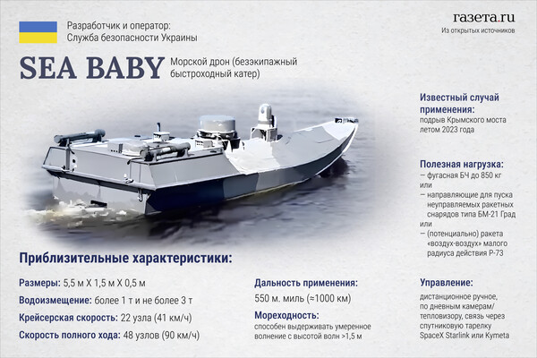 Sea Baby — это типичный украинский безэкипажный катер, представитель целого семейства схожих аппаратов, куда входит, например, Magura V5. Такое разнообразие связано в основном с тем, что их создают разные частные компании и государственные службы, — сущностной же разницы между изделиями почти нет. Sea Baby, например, создан СБУ под свои задачи.