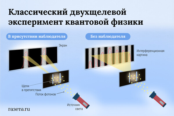 — Вы имеете в виду классический эксперимент квантовой физики с фотоном? Где фотон пролетает через две щели, и, если человек за ним наблюдает, то он видит через какую щель пролетает фотон, который оставляет на стене характерный след. А, если человек не наблюдает за прохождением фотона, то на стене остается интерференционная картина, характерная для волны? — Да, классический двухщелевой эксперимент. Это выглядит очень странно, но свет (фотоны) может вести себя как волна, когда человек не наблюдает за точным прохождением фотонов сквозь щели — что дает нам на стене классическую картину интерференции, намекающую, что фотоны проходят одновременно через обе щели. Но если мы фиксируем путь прохождения фотона, и мы знаем, через какую из двух щелей он проходит, то интерференционная картина разрушается.