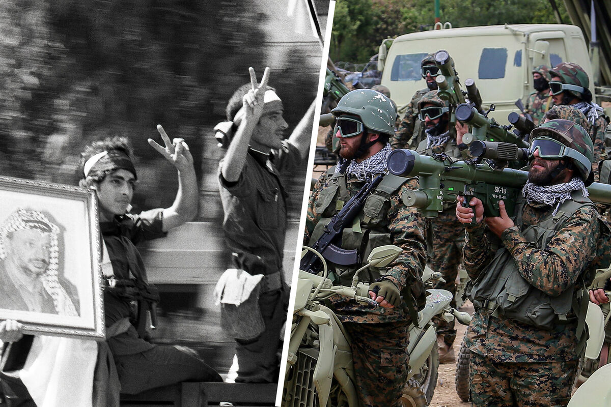 Слева — эвакуация бойцов ООП из Бейрута с портретом Арафата в руках. Справа — бойцы «Хезболлы»