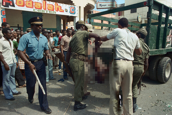 Труп мужчины выгружают из грузовика в центре Порт-о-Пренса на глазах тонтон-макута, 1986 год