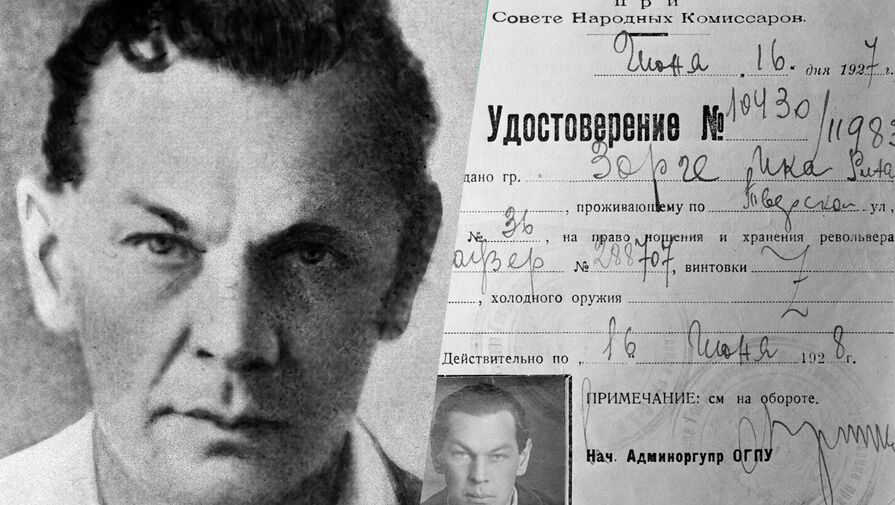 Рихард Зорге и удостоверение, выданное советскому разведчику Объединенным Государственным Политическим Управлением при Совете Народных Комиссаров на право ношения и хранения пистолета «Маузер» в 1927 году