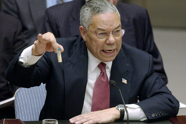По расхожему представлению, повод для вторжения дала «пробирка Колина Пауэлла», которой он тряс на Совбезе ООН 5 февраля 2003 года. Якобы в этой пробирке были образцы добытого разведкой в Ираке бактериологического (или химического) оружия, которые принесли на заседание в качестве наглядного доказательства. Поскольку потом следов массового производства оружия массового поражения (ОМП) в Ираке найти не удалось, пробирка стала символом лжи, фабрикации доказательств.