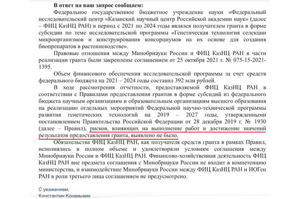 «Рисков, влияющих на выполнение работ и достижение значений результатов предоставления гранта, выявлено не было. Обязательства ФИЦ КазНЦ РАН, как получателя средств гранта в рамках Правил, исполнялись в полном объеме и удовлетворяли условиям соглашения между Минобрнауки России и ФИЦ КазНЦ РАН», — сообщили в ведомстве.