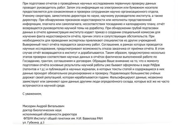 «При подготовке отчетов о проведенных научных исследованиях первичную проверку данных проводит руководитель работ. Затем эта информация на электронном или бумажном носителе предоставляется для ознакомления и проверки сотрудникам научно-организационного отдела, Ученому секретарю, заместителю директора по науке, научному руководителю института, а также директору. При обнаружении признаков недостоверности или неполноты представленной информации, плагиата или самоплагиата, несоответствия техзаданию и календарному плану, отчет возвращается руководителю научной темы на доработку. При обнаружении грубой подтасовки данных в отчете, администрация института издает приказ о создании специальной комиссии для изучения факта недостоверности отчета, причин этого и сопутствующих обстоятельств. При необходимости для проведения экспертизы привлекают специалистов из других учреждений. Выверенный текст отчета передается заказчику работ. Соглашения, в рамках которых проводятся научные исследования, предусматривают возможность отказа заказчика от приемки отчета. В этом случае отчет возвращается в институт и дорабатывается. Таким образом, предусмотрено несколько этапов проверки соответствия научных данных в отчетах фактически выполненной работе по Госзаданию, грантам, соглашениям и договорам», — рассказал Мисюрин «Газете.Ru».