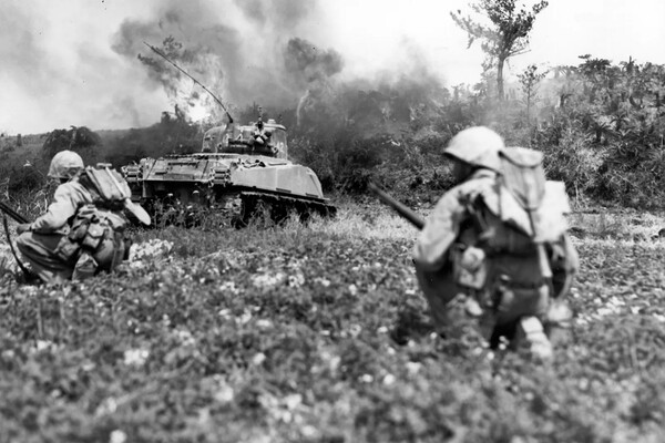 Самые крепкие бункеры и глубокие пещеры могли бы пережить бомбардировку, но к тому моменту армия США имела богатый опыт штурма укреплений, полученный на Окинаве и Иводзиме — другом острове-крепости, взятом весной 1945 года. Например, хорошо зарекомендовала себя тактика танковых пар: обычный танк «Шерман» бронебойными снарядами делал в стене ДОТа (железобетонной огневой точки) дырку, а его огнеметная версия («Зиппо») заливала через нее пламя.