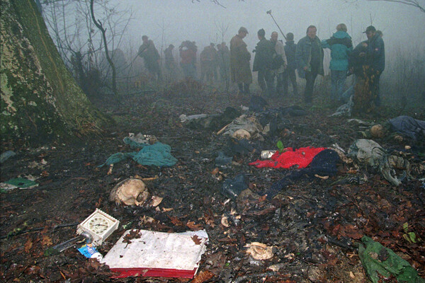 Журналисты осматривают место гибели солдат-мусульман в Сребренице, 1996 год