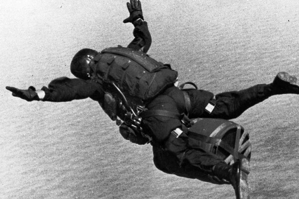 Американский парашютист прыгает с макетом ранцевой атомной бомбы, закрепленным между ног
