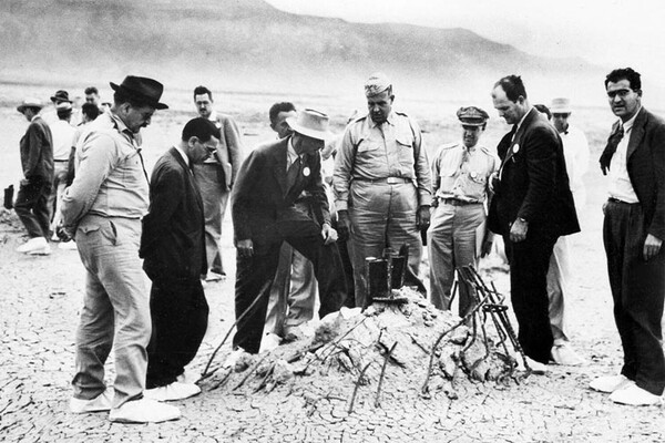 Роберт Оппенгеймер (в шляпе) осматривает пеньки опор башни после ядерных испытаний «Тринити»
