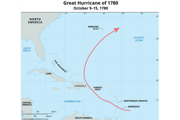 Один из таких ураганов и сформировался в центральной Атлантике в начале октября 1780 года. К сожалению, на тот момент у человечества еще не было спутниковых снимков, поэтому точное место образования этого циклона неизвестно. Но, исходя из архивных метеорологических данных, можно понять, что он появился в районе островов Кабо-Верде у Западной Африки. По-видимому, циклон начал двигаться на запад и в итоге достиг Карибских островов, где 9 октября его заметили у Барбадоса.