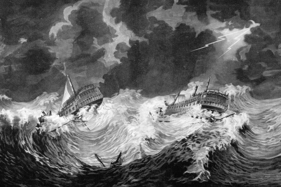 Royal Museums GreenwichУраган срывал с деревьев кору и повалил или сломал каждое дерево на Барбадосе. Именно этот факт позволил реконструировать современным метеорологам примерную силу ветра, поскольку в ту эпоху еще не существовало подходящих для этого приборов. Ветер разрушил на острове все дома до единого, а адмирал Джордж Родни вспоминал, что даже тяжелые пушки летали в воздухе на высоте 30 метров. Всего на острове, имевшем население меньше 100 тысяч, погибло около 4500 человек, — при этом тщательность подсчета жертв среди чернокожих рабов неясна.