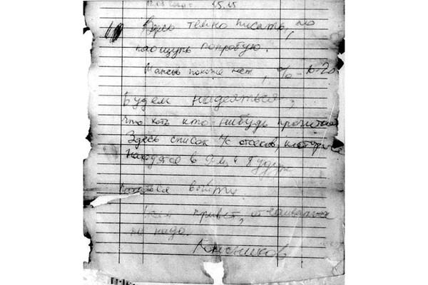 Записка старшего мичмана Андрея Борисова очень похожа на нее по содержанию. Личное послание родным, написанное впопыхах и с ошибками на клочке бумаги.