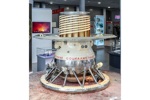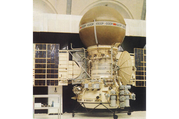 Реплика «Венеры-9». Видны посадочные амортизаторы внизу, тормозная «юбка» и спиральная антенна сверху