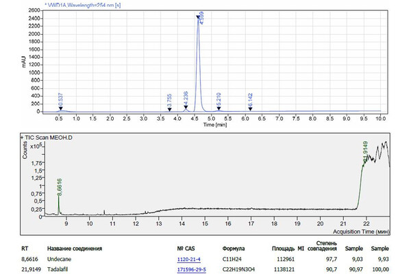 В ходе лабораторного анализа методом газовой хроматографии с масс-спектрометрическим детектированием исследователи подтвердили наличие тадалафила (CAS 171596-29-5, формула C22H19N3O4) в БАДе. Другой анализ методом жидкостной хроматографии с масс-спектрометрическим детектированием также подтвердил наличие тадалафила в меде.