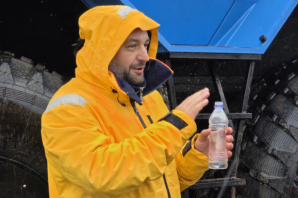 Директор Инжинирингового центра «Автономная энергетика» МФТИ/РТ-РБ Юрий Васильев держит бутылку с водой из выхлопной трубы «Русака»