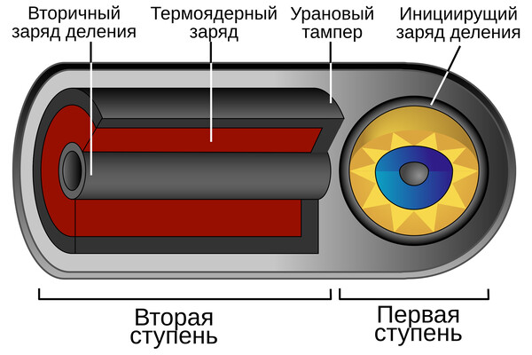 Поэтому в январе 1954 года Андрей Сахаров и Яков Зельдович послали научному руководителю разработки РДС-6 Юлию Харитону докладную записку. В ней они предлагали схему заряда из двух блоков, заключенных в массивный корпус: первичной атомной бомбы и вторичной термоядерной «слойки» (конструкции из чередующихся концентрических слоев урана-235, урана-238 и термоядерного горючего). Предполагалось, что при взрыве атомной бомбы газы будут поступать из этой камеры к термоядерному блоку, создавая давление, достаточное для его сжатия и зажигания реакции синтеза.