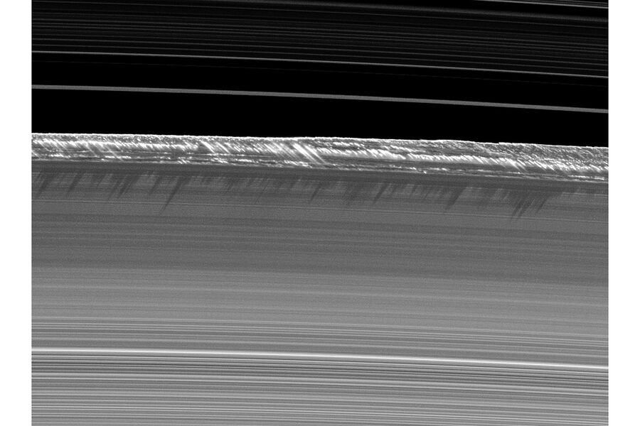 NASA/JPL/Space Science InstituteШирина классических колец варьируется от 15 до 25 тысяч километров. При этом их толщина не превышает 30 метров, а кольцо C и вовсе имеет 5 метров в глубину — поэтому плоская структура колец это не обман зрения, а астрономический факт. Связано это с тем, что составляющие кольца частицы вращаются по орбите строго вдоль экватора. Несмотря на малую толщину, в кольце B присутствуют вертикальные структуры, выступающие из него примерно на 2,5 километра и отбрасывающие тени. Ученые считают, что это — невидимые в телескопы микролуны, входящие в состав кольца.