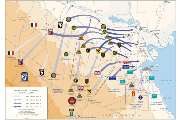 Но наиболее важной причиной столь блестящей победы историки обычно называют обходной маневр, который предпринял Шварцкопф. Иракцы считали, что войска коалиции нанесут основной удар на Кувейт вдоль побережья, и сосредоточили основные силы и средства там. Вместо этого американо-британские механизированные войска пошли в прорыв в сотнях километрах к северо-западу от побережья, где оборона была слабее. Левый фланг наступающим танковым колоннам обеспечивала серия воздушных десантов, высаженных в сотнях километрах в тылу Ирака. Прорвавшиеся на пару сотен километров танки затем повернули направо, на восток, стремясь запереть врага в Кувейте, как в ловушке. В итоге из нее иракцы еле успели унести ноги, по дорогам, которые патрулировала авиация коалиции.