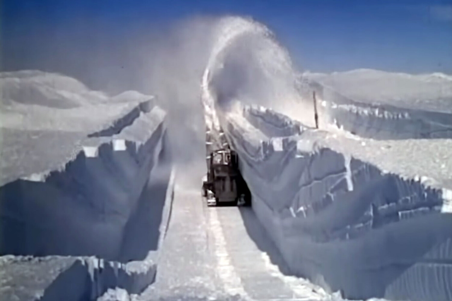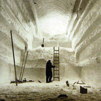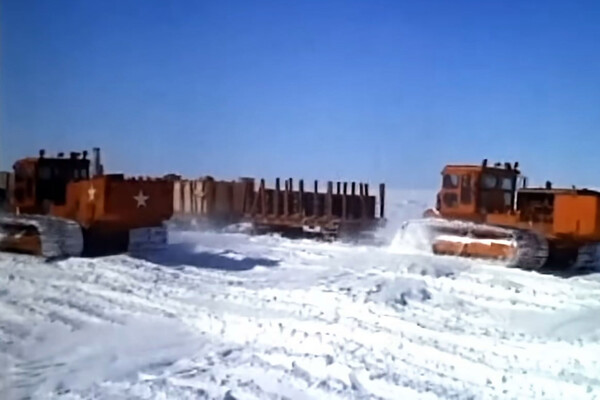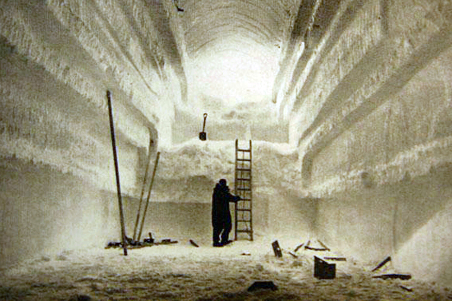 Это были строители Кемп-Сенчури — новой подледной научно-исследовательской базы. В обозначенном месте с саней сгрузили тяжелую снегоуборочную технику, изначально созданную для расчистки дорог в горных районах Швейцарии. Здесь же ей предстояло не чистить, а копать: фреза слой за слоем снимала лед и утрамбованный снег, а машина выбрасывала его наверх через трубу. Вырытые траншеи сверху перекрывали сводом из стальных листов, которые сверху засыпали быстро спекающимся льдом.