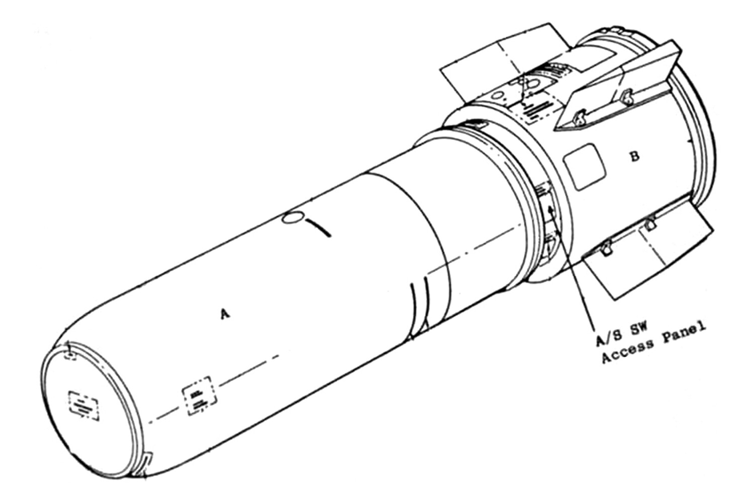 Чертеж термоядерной бомбы Mark 39. В хвостовой части, между стабилизаторами, можно заметить отверстия, в которые входят предохранительные стержни